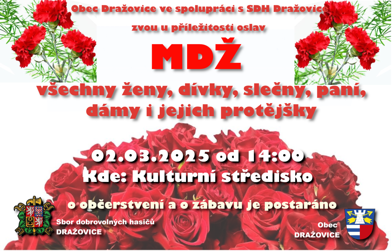 MDŽ všechny ženy, dívky, slečny, paní, dámy i jejich protějšky 02.03.2025 14:00 do kulturního střediska. O občerstvení a zábavu je postaráno.